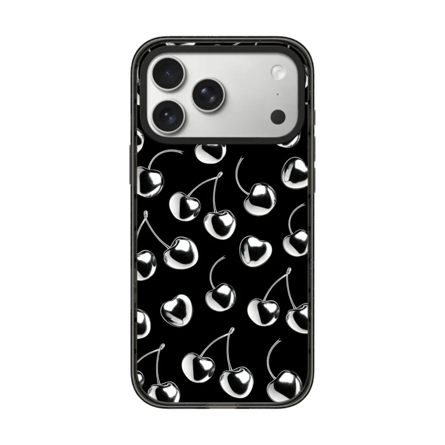 Sleek and Monochromatic. Our Chrome Cherry case is a masterclass in modern minimalism. Featuring high-shine, liquid-silver cherries set against a bold obsidian backdrop, it’s the ultimate accessory for a sharp, polished look. This high-contrast design strips away the color to focus on pure reflection and form, making it the perfect piece for anyone who loves an edgy, high-fashion aesthetic.