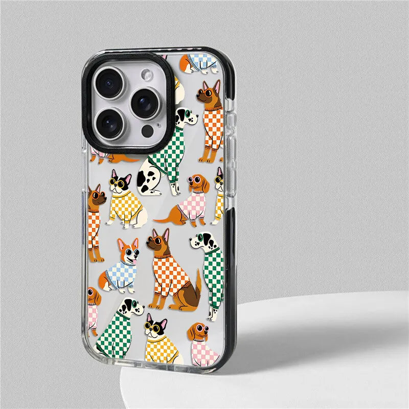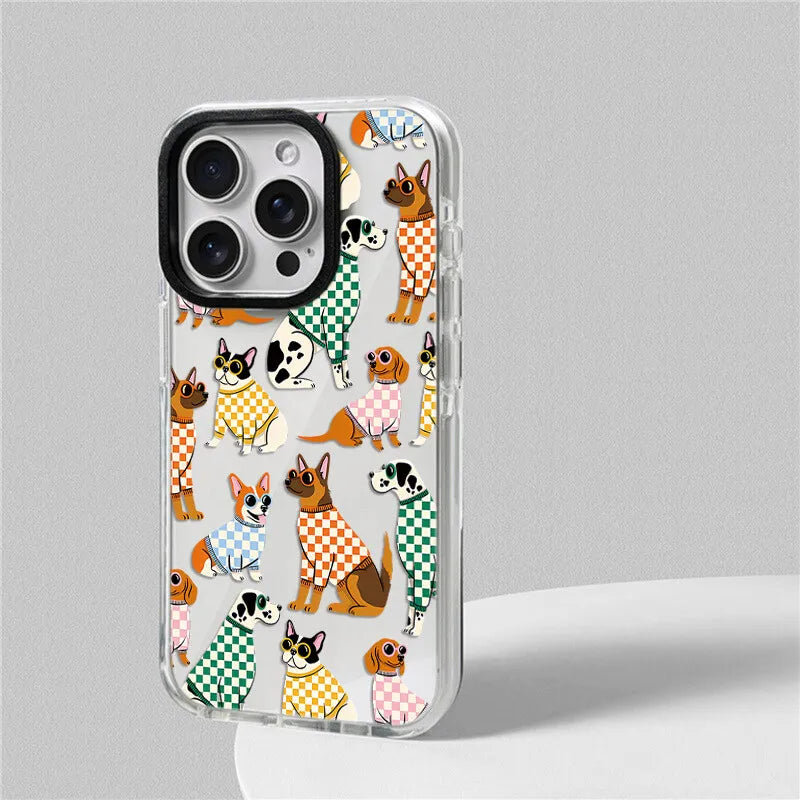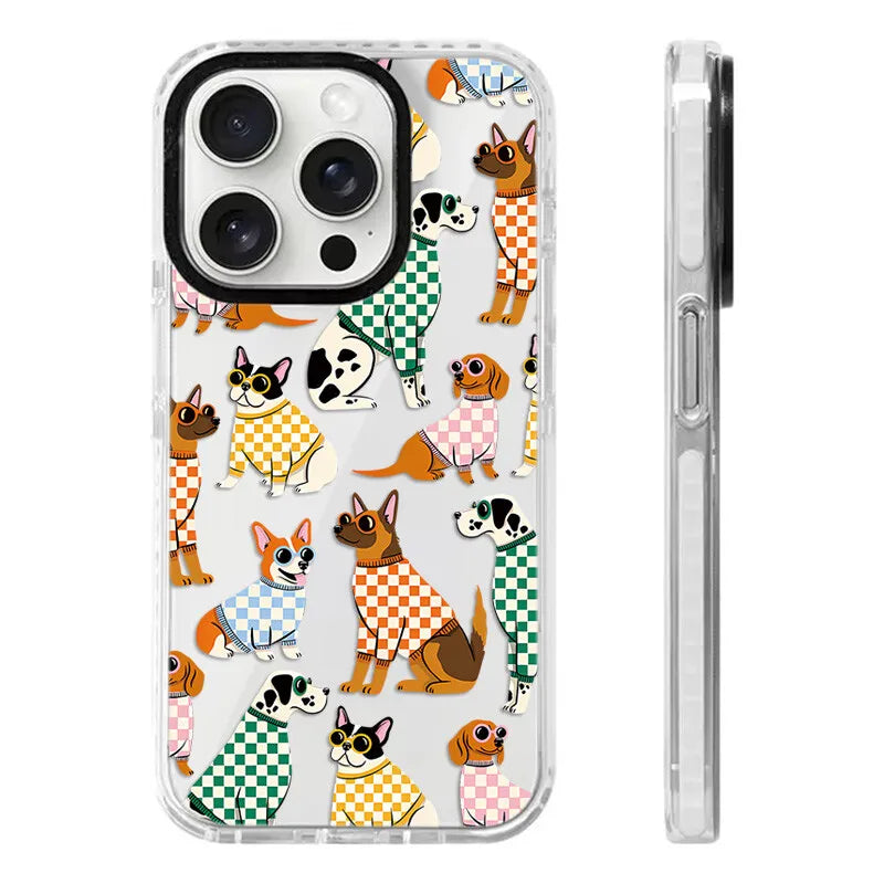Playful and Bold. Our Sweater Dogs features a lively parade of charismatic dogs rocking stylish shades and vibrant sweaters against a crystal-clear backdrop. It’s the ultimate statement piece for animal lovers. A witty and colorful accessory that perfectly captures your fun-loving personality while keeping your phone safe.