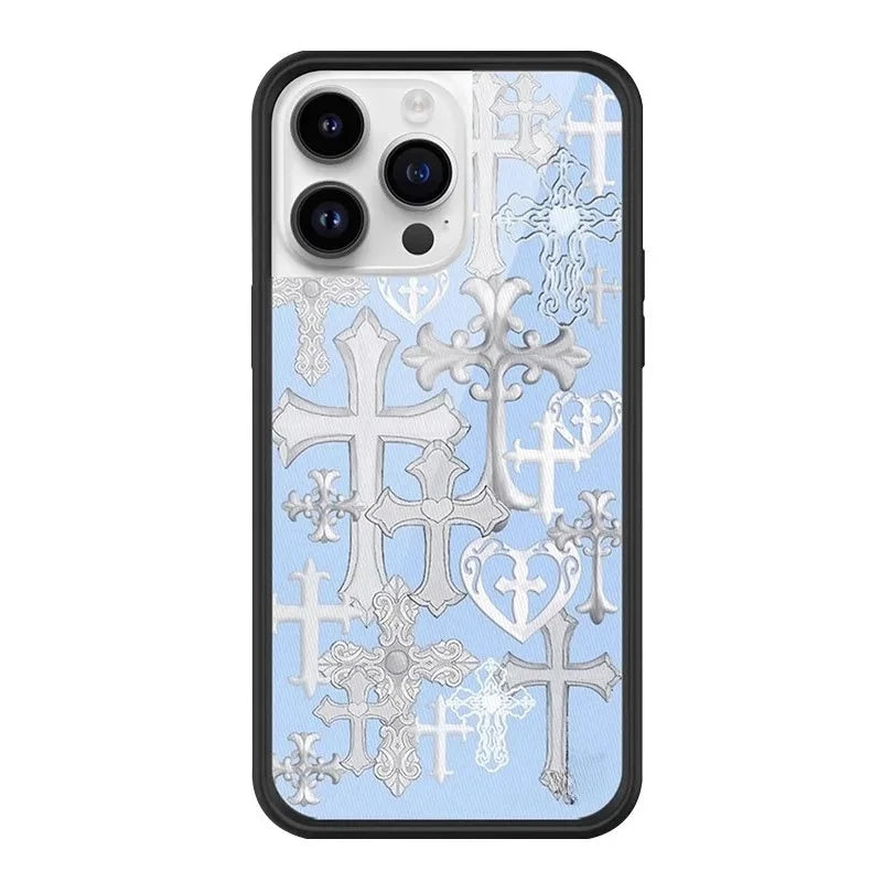 Edgy and Ethereal. Our The Chrome Cross case is a bold intersection of traditional symbolism and futuristic design. Featuring an array of liquid-chrome crosses and intricate heart motifs set against a serene sky-blue backdrop, it strikes a perfect balance between toughness and tranquility. With its high-shine, 3D-effect textures, this case is the ultimate statement piece for those who embrace a modern-gothic aesthetic with a high-fashion, Y2K twist.